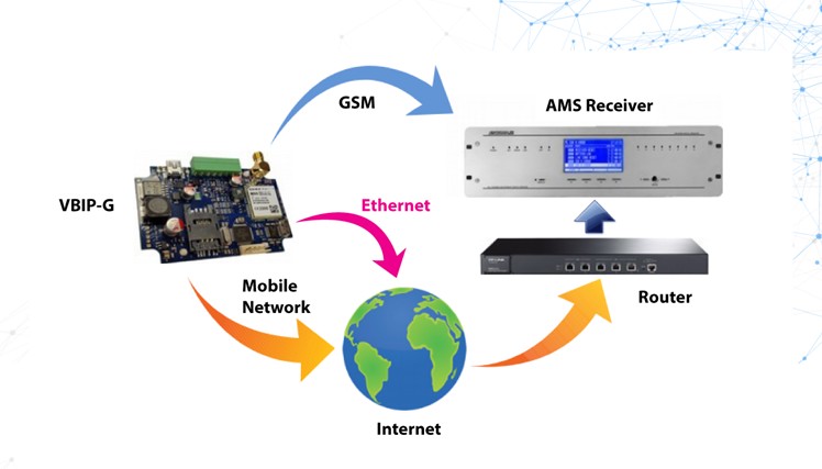Η συσκευή επικοινωνίας VBIP-G λαμβάνει τα μηνύματα από το Telco Interface του πίνακα ελέγχου ασφάλειας, σε μορφή Contact ID, και τα προωθεί στο κέντρο της Υπηρεσίας Παρακολούθησης Συναγερμών (AMS) μέσω ενσύρματου δικτύου ή μέσω του ίντερνετ κινητής τηλεφωνίας.