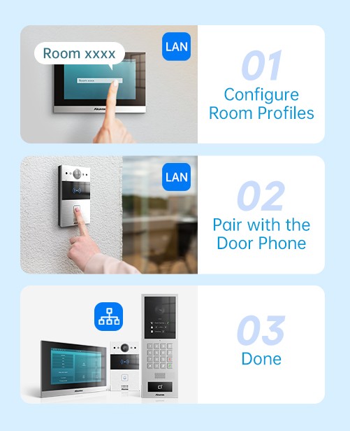 Η δημιουργία ενός δικτύου πρόσβασης δεν ήταν ποτέ πιο εύκολη: με δύο μόνο βήματα —διαμόρφωση του προφίλ δωματίου και συγχρονισμός με το door phone— ενεργοποιούνται οι λειτουργίες κλήσης, ξεκλειδώματος και παρακολούθησης.