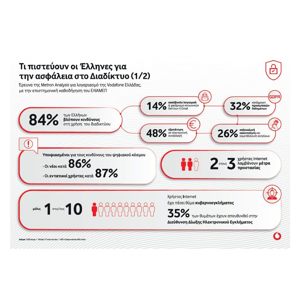 Πανελλαδική έρευνα για την ασφάλεια στο διαδίκτυο διενήργησε και παρουσίασε η Metron Analysis, για λογαριασμό της Vodafone Ελλάδαςμε την επιστημονική καθοδήγηση του ΕΛΙΑΜΕΠ, στο πλαίσιο του Delphi Economic Forum VIII, που πραγματοποιήθηκε μεταξύ 26-29 Απριλίου 2023. Η έρευνα προσεγγίζει την εμπειρία και τις αντιλήψεις των χρηστών του διαδικτύου αλλά και του συνολικού πληθυσμού στην Ελλάδα, εστιάζοντας στον τρόπο που αξιοποιούμε την τεχνολογία, τους αντιλαμβανόμενους κινδύνους, αλλά και τις μορφές προστασίας έναντι αυτών.