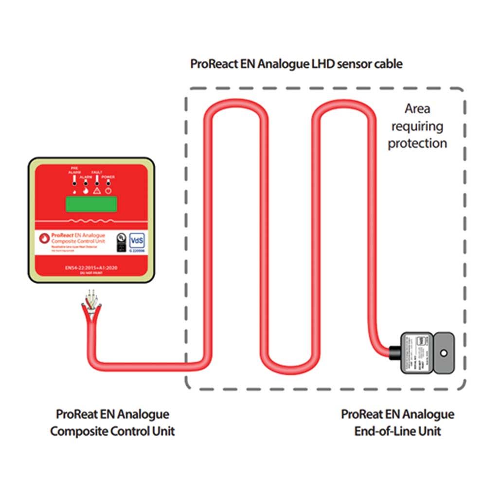 Το καλώδιο- αισθητήρας γραμμικής ανίχνευσης αποτελείται από 4 πυρήνες και διατίθεται σε στροφεία των 100μ, 200μ και 500μ. Η τερματική μονάδα ελέγχου της γραμμής συμπεριλαμβάνεται σε κάθε ελεγκτή. Το σύστημα γραμμικής ανίχνευσης θερμότητας μπορεί να αποτελέσει και συσκευή ενός διευθυνσιοδοτούμενου συστήματος πυρανίχνευσης, καθώς πέραν της απλής συμβατικής έκδοσης του ελεγκτή με εξόδους ρελέ, υπάρχει διαθέσιμη και έκδοση με ενσωματωμένη διευθυνσιοδοτούμενη μονάδα, ώστε να ενταχθεί σε βρόχο με το πρωτόκολλο επικοινωνίας Hochiki ESP. Έτσι, υπάρχει και άψογη συνεργασία με τους πίνακες πυρανίχνευσης της NSC Solution F1 & F2. Το σύστημα γραμμικής ανίχνευσης θερμότητας ProReact Analogue (EN) είναι ιδανικό για τοποθέτηση σε Parking, εργοστάσια και μονάδες παραγωγής, αποθήκες, σχάρες καλωδίων, ταινίες μεταφοράς, Data Centers, κ.ά.