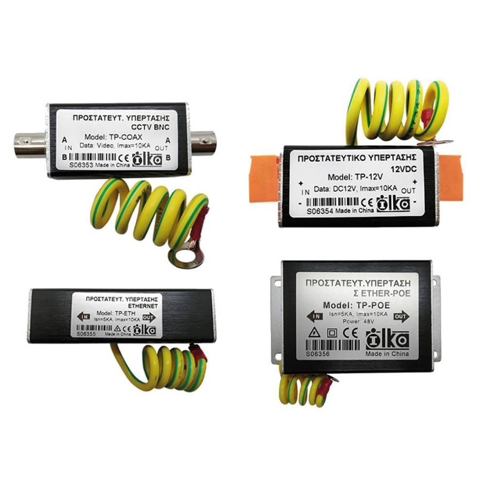 Οι ατμοσφαιρικές εκκενώσεις παράγουν μεγάλες ποσότητες ενέργειας που δημιουργούν υπερτάσεις από επαγωγή στα ηλεκτρικά δίκτυα, προκαλώντας βλάβες στον ηλεκτρικό και ηλεκτρονικό εξοπλισμό. Τα προστατευτικά υπερτάσεων, χρησιμοποιούνται για να περιορίσουν κατά το δυνατό αυτές τις βλάβες, περιλαμβάνοντας gas protectors, που απορροφούν αιχμές υπέρτασης.Οι ατμοσφαιρικές εκκενώσεις παράγουν μεγάλες ποσότητες ενέργειας που δημιουργούν υπερτάσεις από επαγωγή στα ηλεκτρικά δίκτυα, προκαλώντας βλάβες στον ηλεκτρικό και ηλεκτρονικό εξοπλισμό. Τα προστατευτικά υπερτάσεων, χρησιμοποιούνται για να περιορίσουν κατά το δυνατό αυτές τις βλάβες, περιλαμβάνοντας gas protectors, που απορροφούν αιχμές υπέρτασης, εκφορτίζοντάς τες προς την γείωση της εγκατάστασης. Διατίθενται διάφοροι τύποι προστατευτικών, ανάλογα με τον τύπο της σύνδεσης που πρέπει να προστατέψουν (π.χ. Ethernet, RS485, ομοαξονική, τροφοδοσίας, κ.λπ.). Για την προστασία μιας συσκευής πρέπει να χρησιμοποιούνται τα κατάλληλα προστατευτικά πλησίον της και σε όλες τις καλωδιώσεις με τις οποίες αυτή συνδέεται. Θα πρέπει να τοποθετούνται προστατευτικά και στις δύο πλευρές της καλωδίωσης (π.χ. και στην κάμερα και στο καταγραφικό), αν θέλουμε να προστατεύσουμε όλες τις συσκευές της εγκατάστασης. Η παρεχόμενη προστασία εξαρτάται από την ισχύ της υπέρτασης και την ποιότητα της γείωσης της εγκατάστασης και της καλωδίωσης προς αυτήν. Δεν παρέχεται δηλαδή καμιά εγγύηση, ότι οι συσκευές δεν θα υποστούν βλάβη από υπέρταση, αλλά με καλή εφαρμογή και εγκατάσταση οι βλάβες μπορούν να περιοριστούν. Τα προστατευτικά υπερτάσεων έχουν πεπερασμένη ζωή, η οποία εξαρτάται από την ισχύ υπερτάσεων που έχουν απορροφήσει. Γι’ αυτό δεν καλύπτονται από εγγύηση (είναι αναλώσιμα) και θα πρέπει να αντικαθίστανται περιοδικά, ανάλογα με την έκθεσή τους σε υπερτάσεις. Η ΗΛΚΑ ΑΕ. διαθέτει τα εξής μοντέλα προστατευτικών υπέρτασης για εφαρμογές CCTV και IPCCTV: Το TP-COAX, είναι προστατευτικό υπέρτασης ομοαξονικής σύνδεσης 75Ω, διαθέτει είσοδο BNC θηλυκό/έξοδος BNC αρσενικό, ονομαστική τάση προστασίας 5V, μέγιστο ρεύμα εκφόρτισης (8/20μs) προς το καλώδιο της γείωσης 10kA, με περίβλημα αλουμινίου. Το TP-12V, είναι προστατευτικό υπέρτασης τροφοδοσίας 12 VDC, με αφαιρούμενες κλέμες (in/out), ονομαστική τάση προστασίας 12V, μέγιστο ρεύμα εκφόρτισης (8/20μs) προς το καλώδιο της γείωσης 10kA με περίβλημα αλουμινίου. Αντίστοιχα τοTP-ETH, είναι προστατευτικό υπέρτασης Ethernet ως 100 Mbit/s, 2 x RJ45 (in/out), με ονομαστική τάση προστασίας 5V, μέγιστο ρεύμα εκφόρτισης (8/20μs) προς το καλώδιο της γείωσης 10kA και με περίβλημα αλουμινίου. Τέλος, το προστατευτικό υπέρτασης TP-POE Ethernet με PoE ως 1000 Mbit/s, 2 x RJ45 (in/out), διαθέτει ονομαστική τάση προστασίας 60V, μέγιστο ρεύμα εκφόρτισης (8/20μs) προς το καλώδιο της γείωσης 10kA με περίβλημα αλουμινίου.