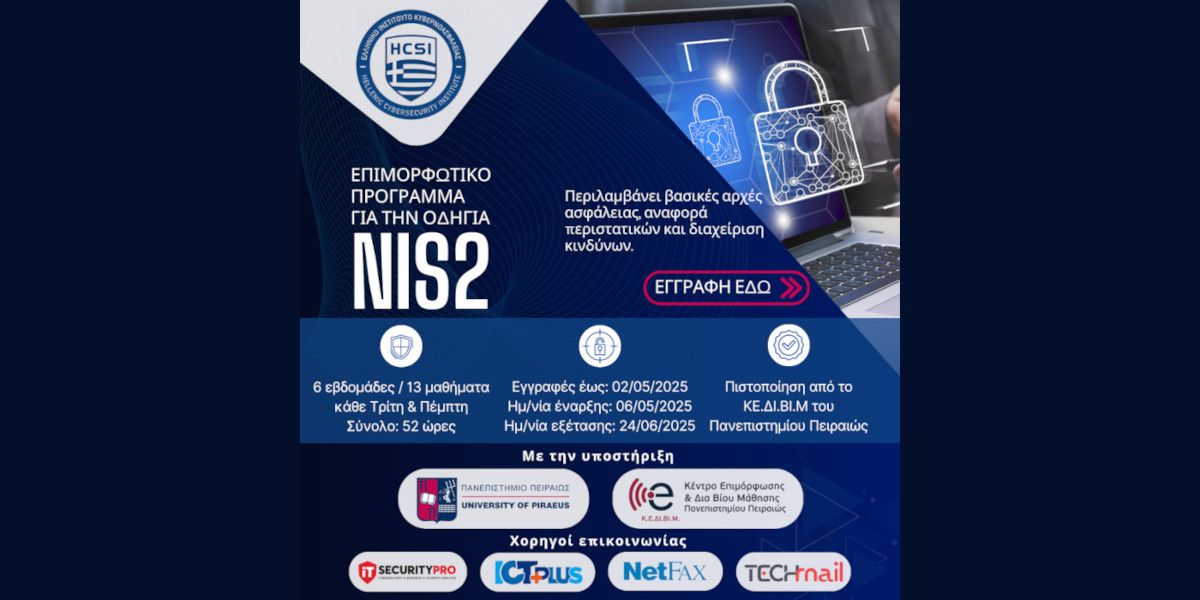 Το Ελληνικό Ινστιτούτο Κυβερνοασφάλειας (HCSI), σε συνεργασία με το ΚΕΔΙΒΙΜ του Πανεπιστημίου Πειραιώς εγκαινιάζει ένα νέο επιμορφωτικό πρόγραμμα, με τίτλο «Εισαγωγή στον Κανονισμό NIS2», στο πλαίσιο της συνεχούς ενίσχυσης της ψηφιακής ασφάλειας και της ευθυγράμμισης με το ευρωπαϊκό κανονιστικό περιβάλλον. Το πρόγραμμα αυτό έρχεται ως απάντηση στις αυξανόμενες ανάγκες συμμόρφωσης με την Οδηγία NIS2 της Ευρωπαϊκής Ένωσης, η οποία αναμένεται να αλλάξει ριζικά τον τρόπο με τον οποίο οι οργανισμοί αντιλαμβάνονται και εφαρμόζουν την κυβερνοασφάλεια.