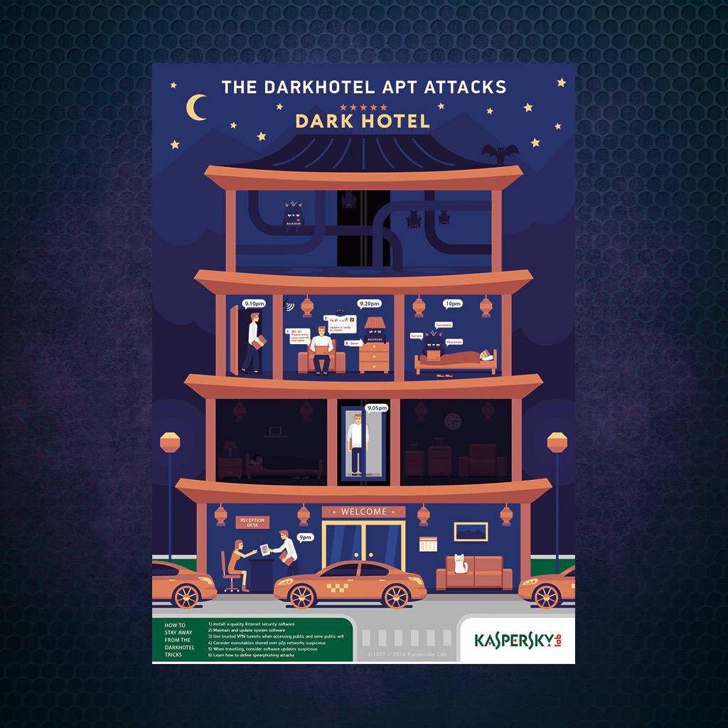 Το 2014, η Kaspersky Lab δημοσίευσε πληροφορίες για τη στοχευμένη εκστρατεία Dark Hotel, η οποία χρησιμοποίησε μια σειρά αποδοτικών τακτικών για να εισβάλλει στα δίκτυα ξενοδοχείων, ακόμη και σε συστήματα που θεωρούνταν ιδιωτικά και ασφαλή. Οι ψηφιακοί εγκληματίες περίμεναν μέχρι τα θύματά τους να συνδεθούν στο δίκτυο Wi-Fi του ξενοδοχείου. Στη συνέχεια, ξεγελούσαν τους υποψήφιους στόχους, οι οποίοι «κατέβαζαν» και εγκαθιστούσαν ένα backdoor,το οποίο υποτίθεται ότι ήταν μια ενημερωμένη έκδοση ενός νόμιμου λογισμικού. Μόλις το backdoor εισερχόταν στο σύστημα, «κατέβαζε» με τη σειρά του πιο προηγμένα εργαλεία για τη συλλογή δεδομένων, υπέκλεπτε όλες τις πληκτρολογήσεις και έψαχνε για προσωρινά αποθηκευμένους κωδικούς πρόσβασης σε προγράμματα περιήγησης και άλλες προσωπικές πληροφορίες.